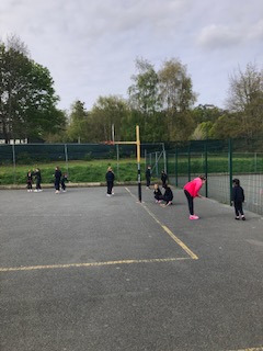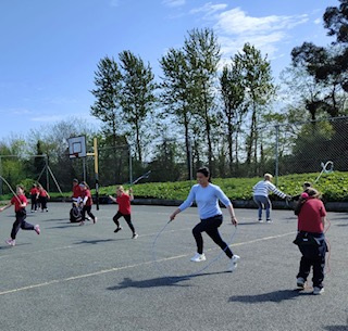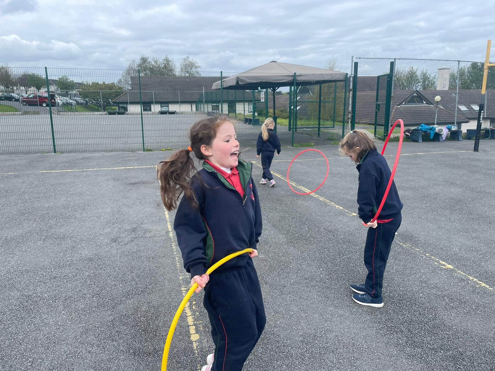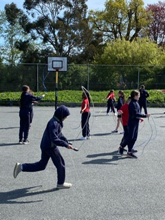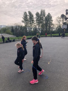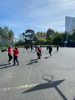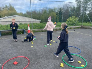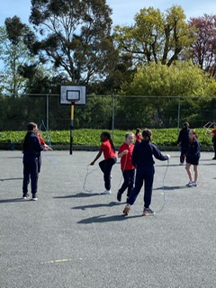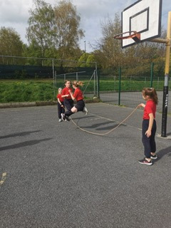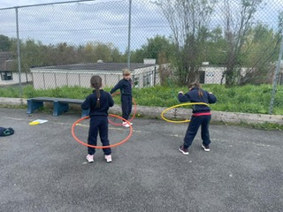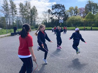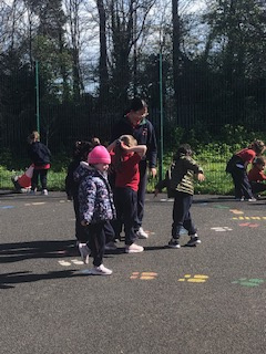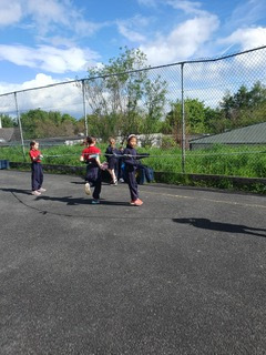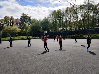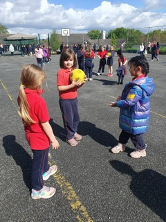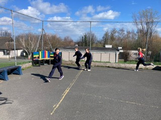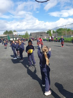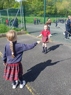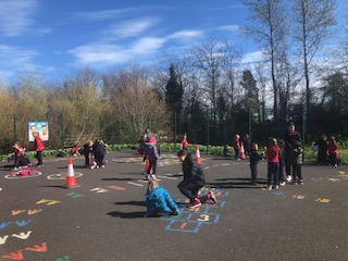 6th class girls have volunteered to skip their own big break to help in the junior infant and junior yards. They go in groups for one week and teach the younger girls games which they can play while on break. The younger girls have been delighted to see them and love playing these new games.