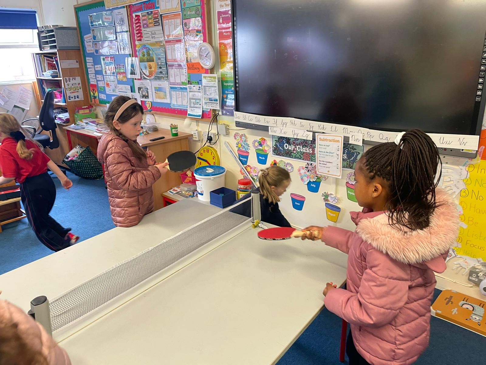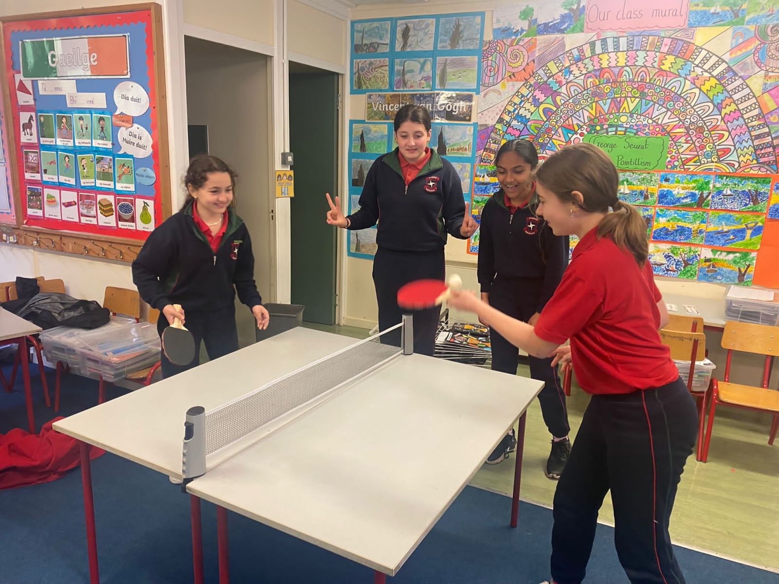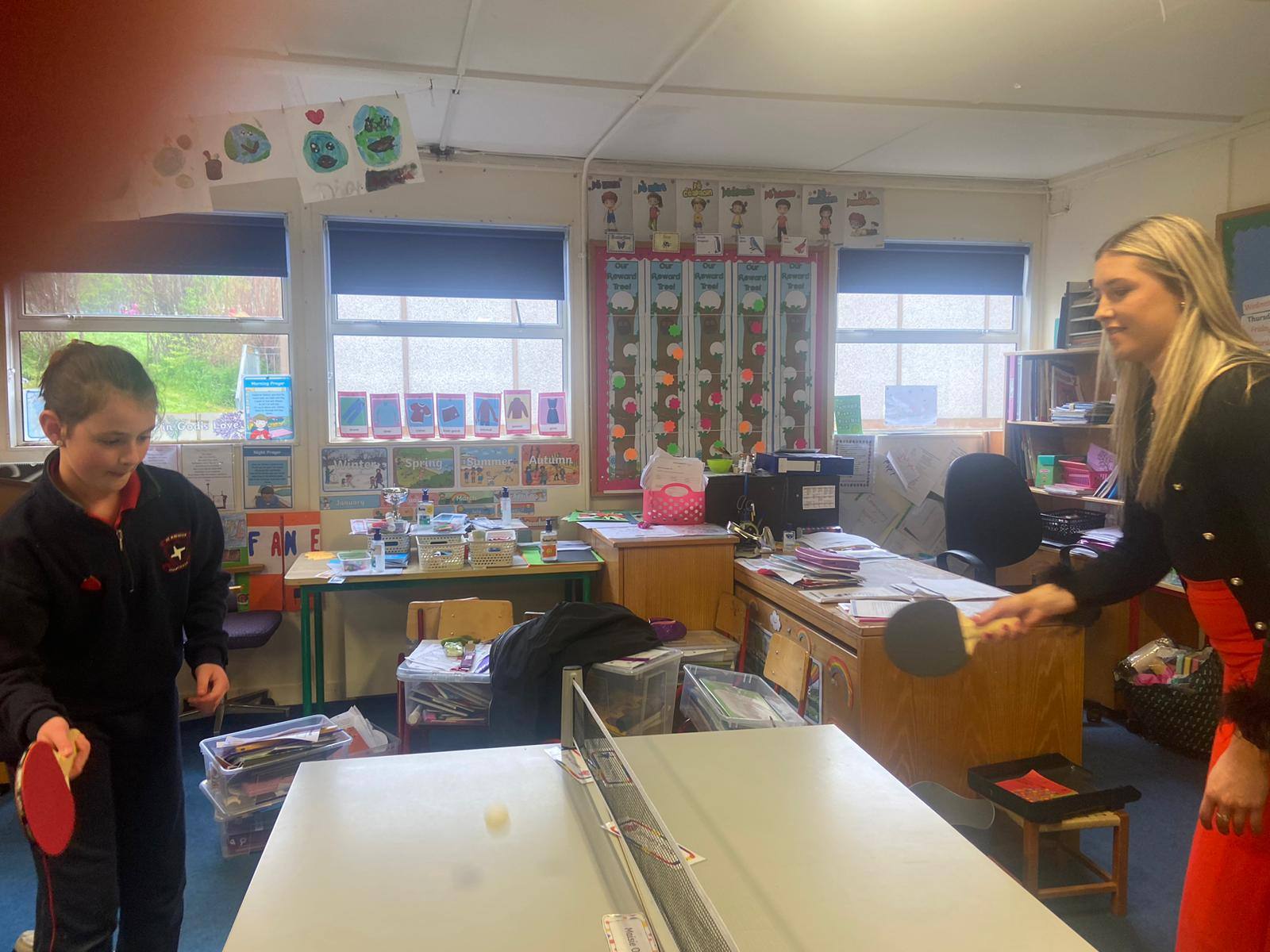 6th class girls have volunteered to skip their own big break to help in the junior infant and junior yards. They go in groups for one week and teach the younger girls games which they can play while on break. The younger girls have been delighted to see them and love playing these new games.